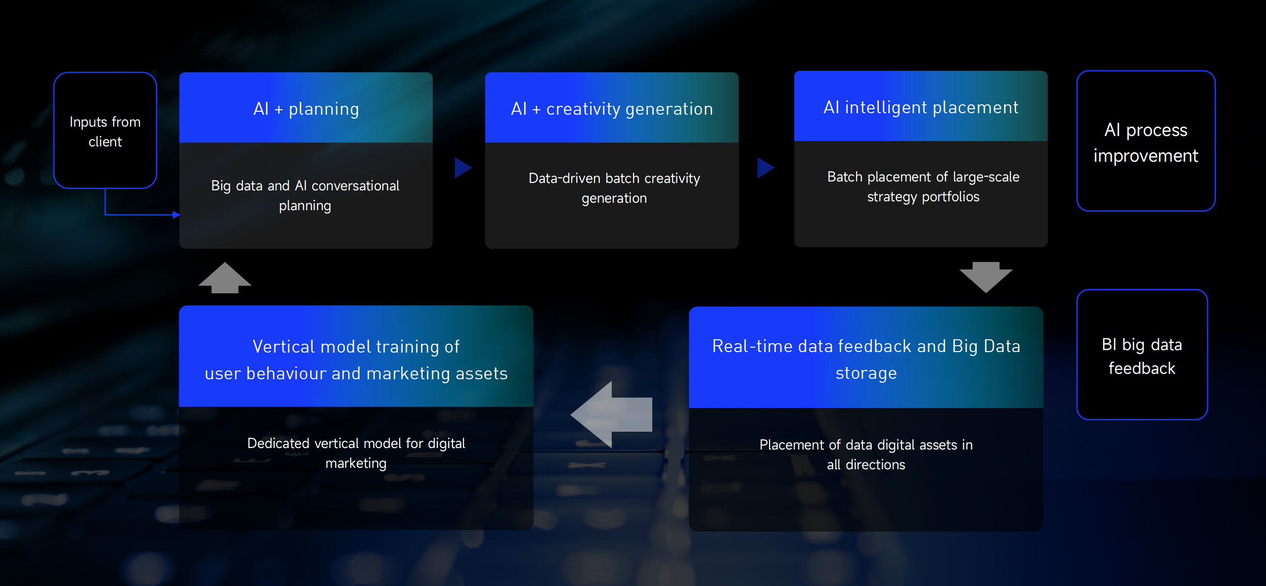 Rapid batch building of advertising plans, enterprise level online material library, data analysis, AI intelligent advertising management to achieve efficient progammatic deliver with improved creation and management efficiency